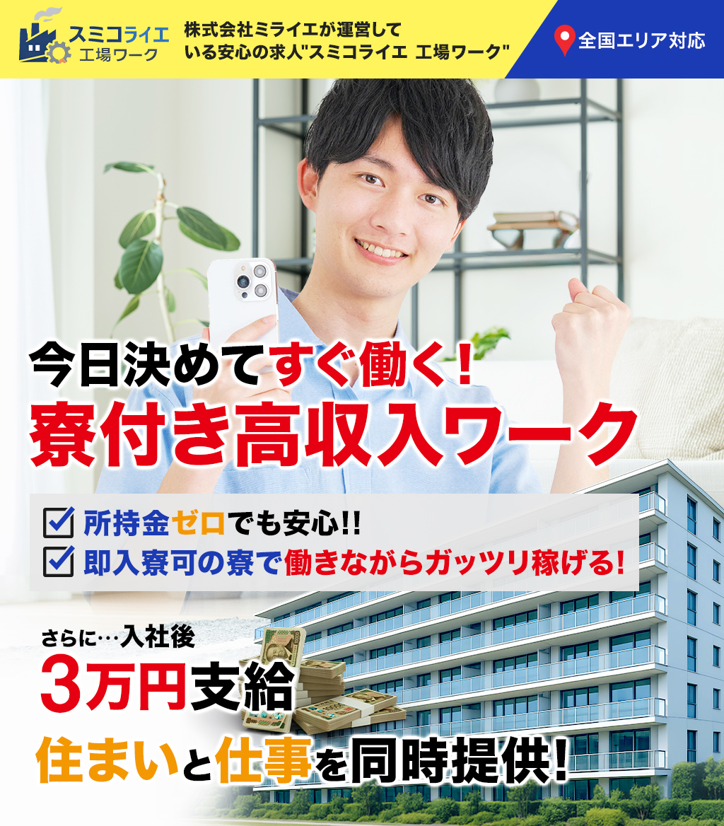 - 寮付きのお仕事がたくさん!(寮費が無料の求人もあります。)